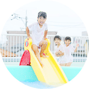 夏の村雲名物、それは開放感いっぱいの屋上プール。太陽と青空の下で、元気に水遊びを楽しみます。